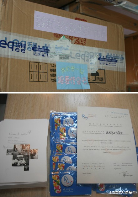 2012年8月10日,北京嫣然天使儿童医院又收到了来自可爱的山东菲迷们寄来的物资,他们分别是:@独孤萧Y-岳祝王菲生日快 @蝶舞寒姐 @丹皮C @缘尽无言 ,感谢你们和像你们一样的菲迷们,以及所有给我们关心和帮助的爱心人士们!有了你们的帮助,我们一定更加努力,让爱心传的更远,让天使之城更加温馨!
