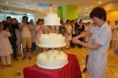 最后,医院领导开香槟、切蛋糕庆贺,全体员工沉浸在院庆的喜悦中。