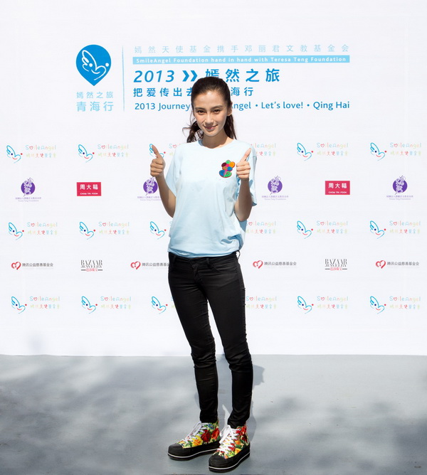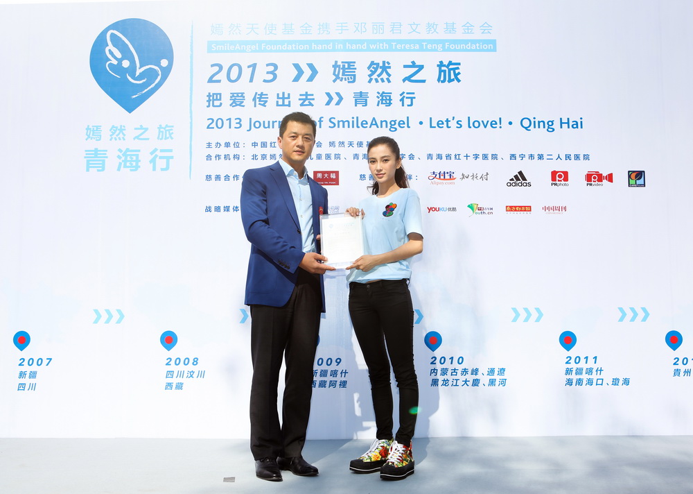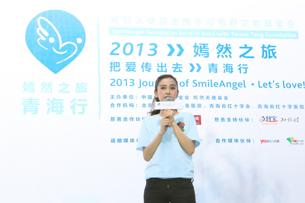 2013年8月19日,嫣然天使基金携手邓丽君文教基金会“2013嫣然之旅•把爱传出去•青海行”医疗救助行动在北京嫣然天使儿童医院举行启动仪式。红十字基金会副理事长刘选国先生、嫣然天使基金创始人李亚鹏先生、嫣然天使基金执行总裁李诗女士、“2013嫣然之旅芭莎珠宝慈善大使”Angelababy小姐、北京嫣然天使儿童医院院长李滨先生、北京嫣然天使儿童医院执行院长杨弘仁先生、北京嫣然天使儿童医院颅颜中心学术委员会主席,嫣然之旅医疗队队长陈仁吉先生、青年艺术家曾健勇、张天幕夫妇、“嫣然之旅”医疗队的志愿者医生们以及来自2013”嫣然之旅“战略合作媒体《芭莎珠宝》和慈善合作伙伴周大福的企业代表们悉数出席活动。