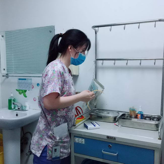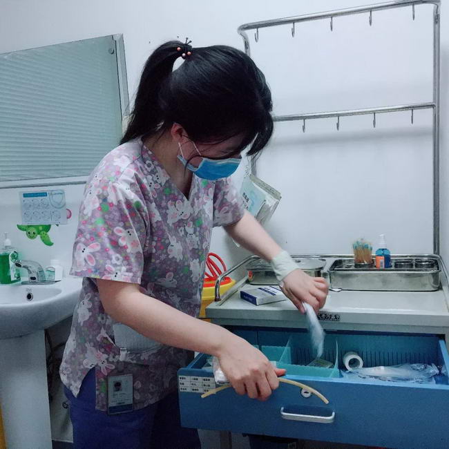 一个忙碌的小姐姐,刚给孩子换完药正在收拾东西。