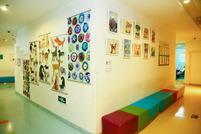图2:陈列于采血室门口的“狗狗欢乐世界”主题作品,这一主题作品希望通过这些色彩鲜艳和健康快乐的艺术作品,激发人们对狗狗的尊重。由于狗狗有特殊的安抚人心的本领,经常被训练为治愈犬,在医疗机构中扮演重要的角色。